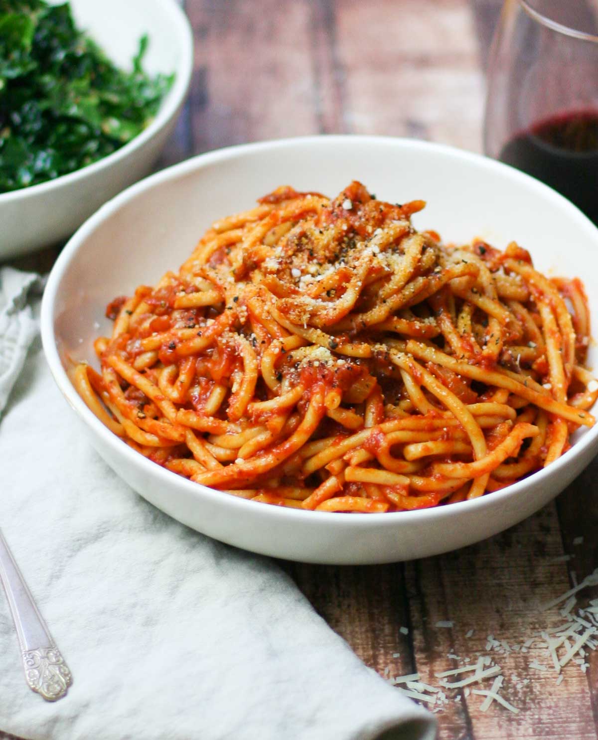 AmatricianaGuanciale, sauce tomate, Parmesan. |